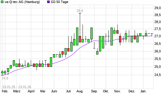 Mit dem Rücksetzer auf 27,00 EUR hat die va-Q-tec-Aktie am 22.01.2026 die 50-Tage-Linie nach unten gekreuzt.