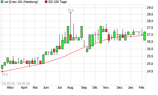 Mit dem Anstieg auf 27,20 EUR hat die va-Q-tec-Aktie am 02.02.2026 die 100-Tage-Linie nach oben gekreuzt.Die va-Q-tec-Aktie befindet sich seit dem 29.08.2024 im langfristigen Aufwärtstrend und ...weiterlesen