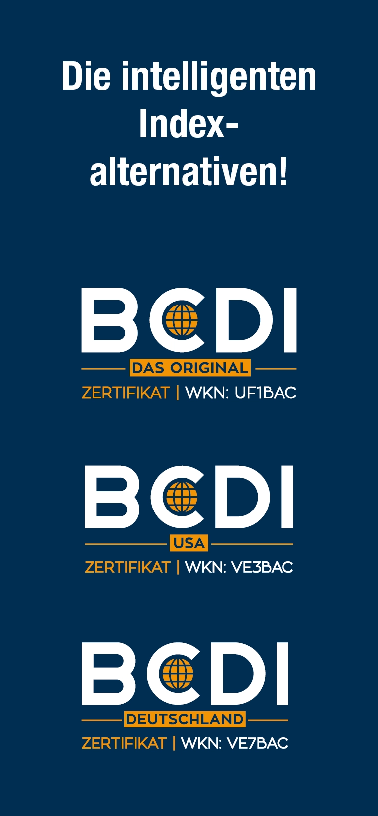 Der BCDI USA umfasst zehn Top-Champions aus den USA und versteht sich damit als Alternative zum Dow Jones und zum S&P 500. Seit 4. November 2019 gibt es das von Vontobel emittierte BCDI-USA-Zertifikat (WKN: VE3BAC). Info.