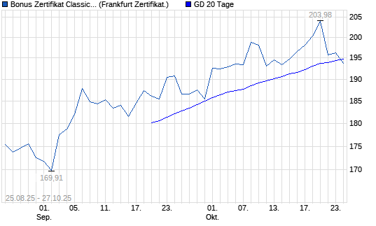 Das Zertifikat bietet dann eine zusätzliche Bonuschance, wenn der Basiswert die Barriere von 135,00 EUR (akt. Sicherheitspuffer: 28,30%) zwischen dem 25.08.25 und dem Ende der Laufzeit nicht berührt oder unterschreitet.