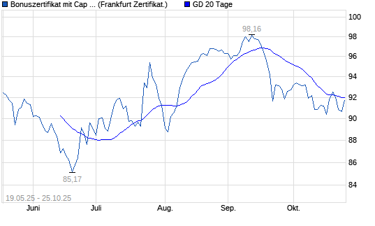 Das Zertifikat bietet dann eine zusätzliche Bonuschance, wenn der Basiswert die Barriere von 74,00 EUR (akt. Sicherheitspuffer: 17,80%) zwischen dem 19.05.25 und dem Ende der Laufzeit nicht berührt oder unterschreitet.
