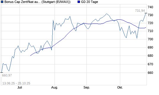 Das Zertifikat bietet dann eine zusätzliche Bonuschance, wenn der Basiswert die Barriere von 600,00 USD (akt. Sicherheitspuffer: 18,87%) zwischen dem 13.06.25 und dem Ende der Laufzeit nicht berührt oder unterschreitet.